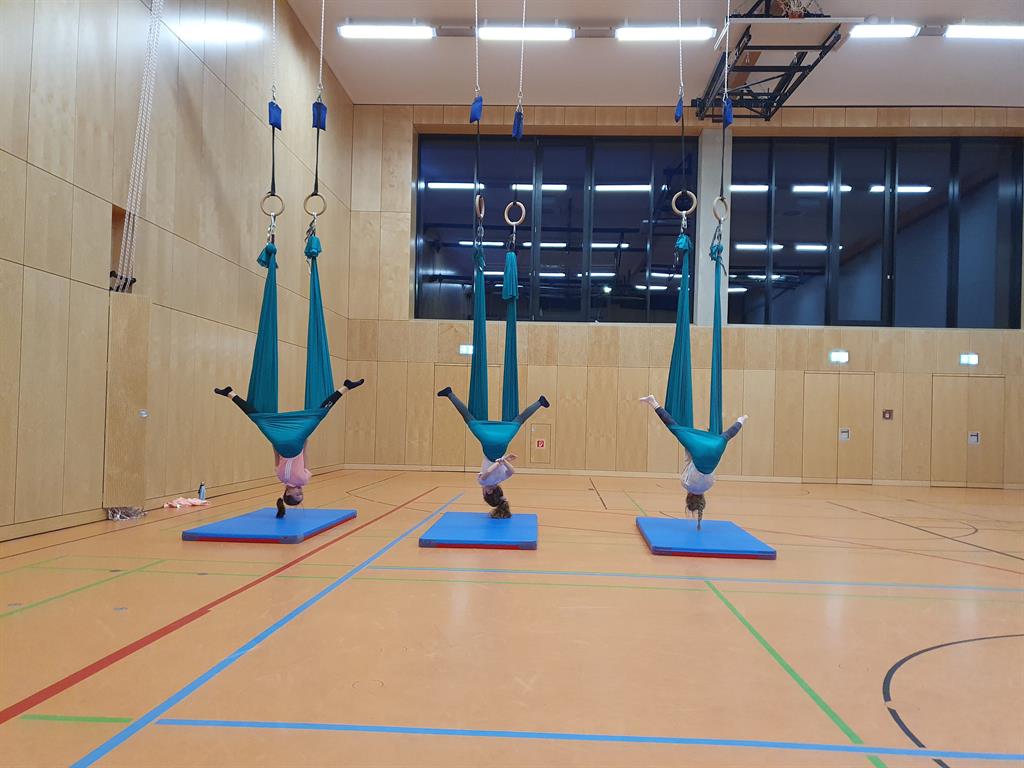Im Anschluss folgen kindgerechte Dehnübungen im und am Tuch, um den Körper zu stärken und um Verletzungen vorzubeugen.